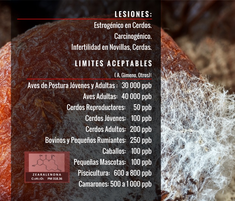 Existen 16 tipos, la más tóxica es la Zearalenona le siguen Alfa y Beta Zearalenol. Es No Polar, más frecuente en el campo, en la tierra, cultivos y recién cosechados. Son micotoxinas del cultivo, a campo. Las afecciones se deben por que es similar a la hormona del celo. Trae problemas reproductivos e inmunes.