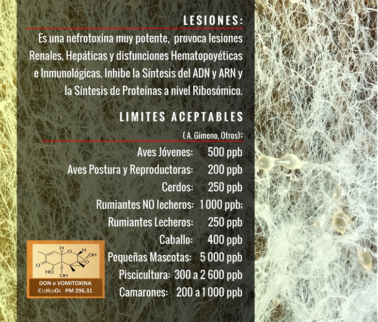 EFECTOS: Rechazo del alimento, Vómitos. Inmunotóxico, altera la digestibilidad del alimento. Diarreas.